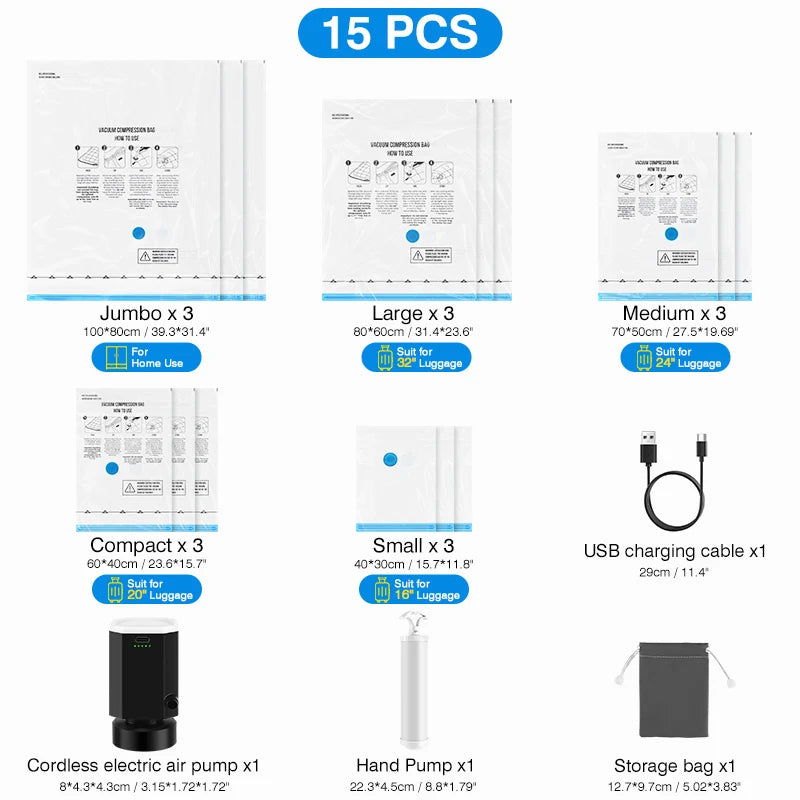 1-15pc Universal Vacuum Storage Bag with Cordless Electric Pump,Rechargeable Wireless Pump for Bags,Space Saver Travel Organizer