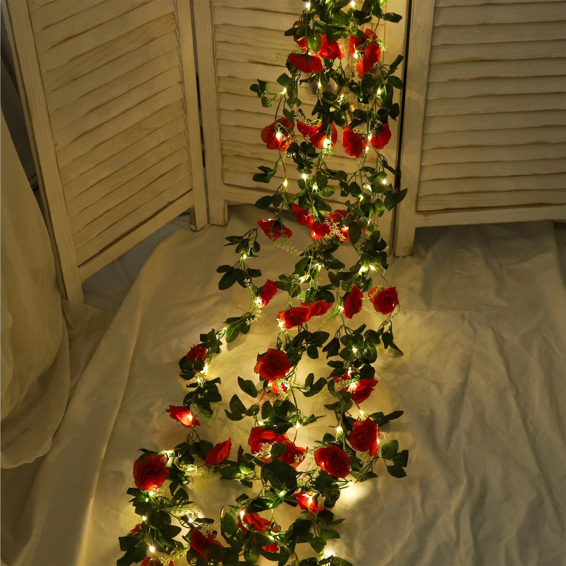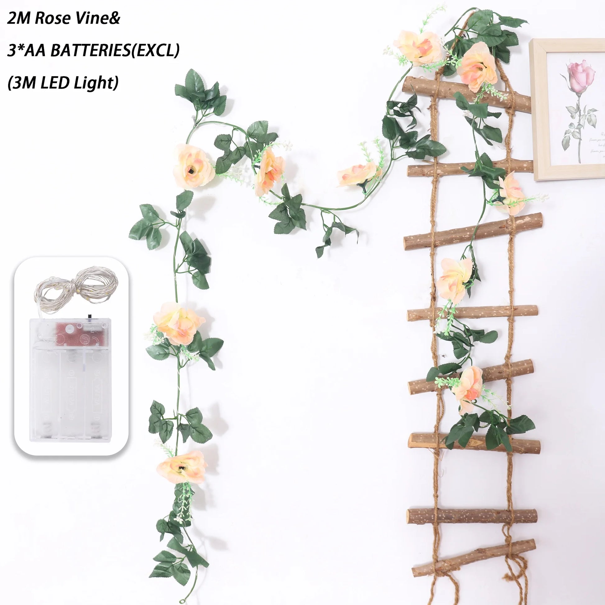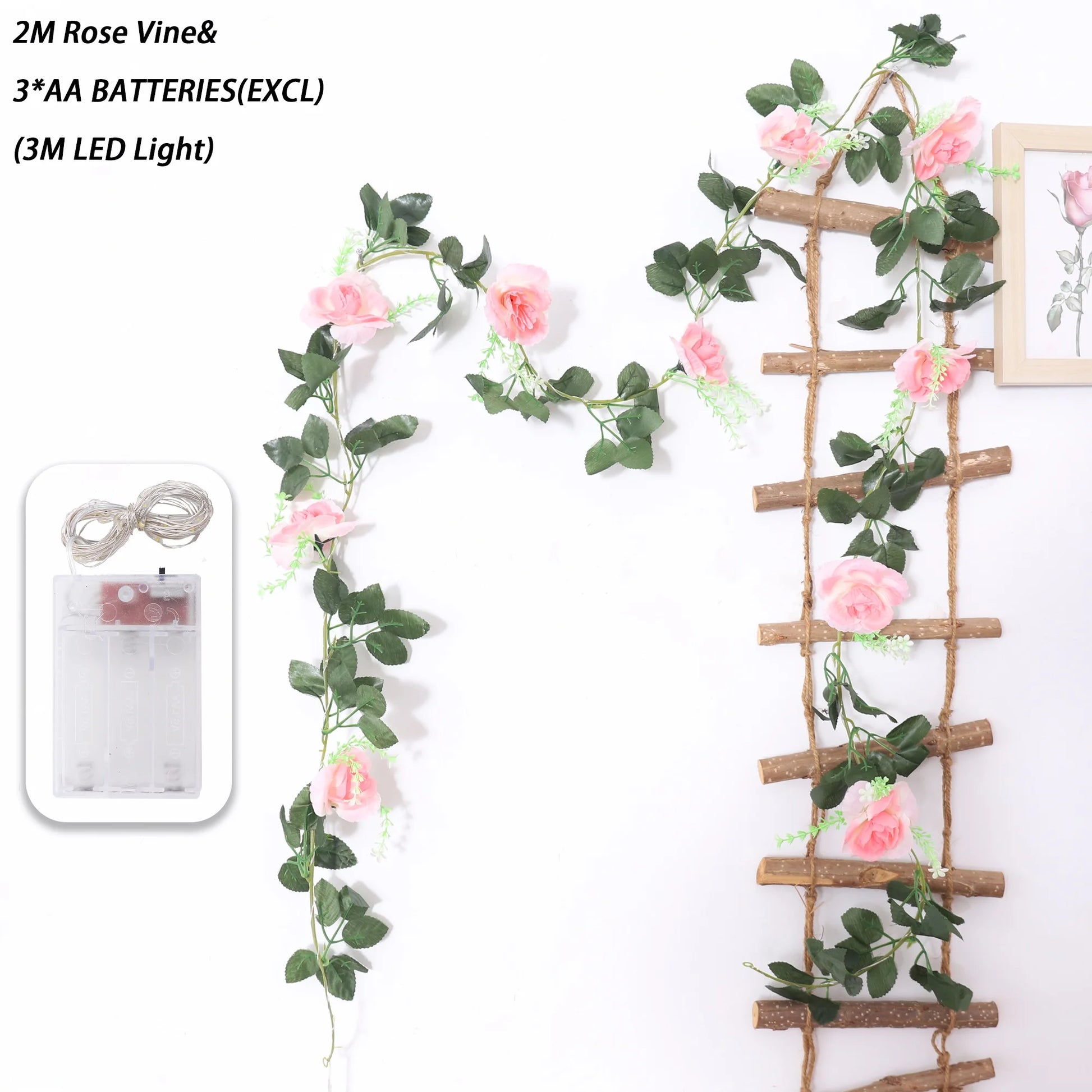 200cm Rose Artificial Flowers Vine LED String Lights For Wedding Garland Home Decor Fake Rose Rattan Hanging Wall Arch Ornament