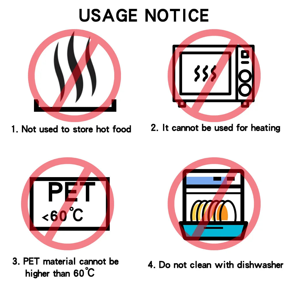 Not suitable for heating, microwaves, ovens, dishwashers, or hot foods (PET material max 60 °C).