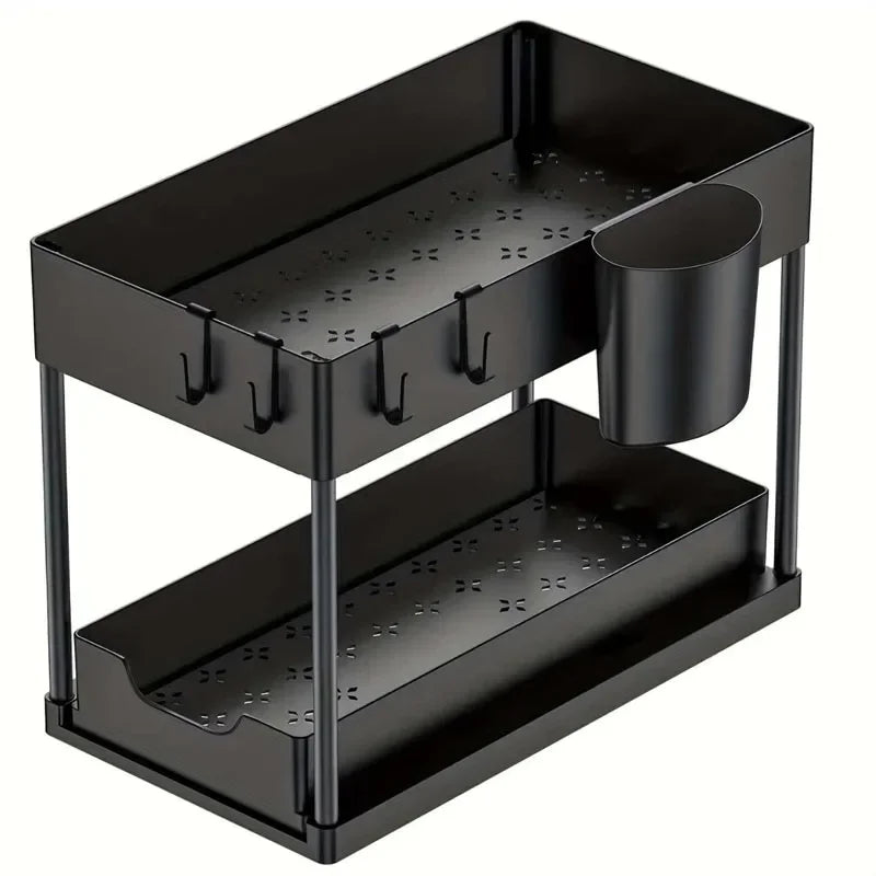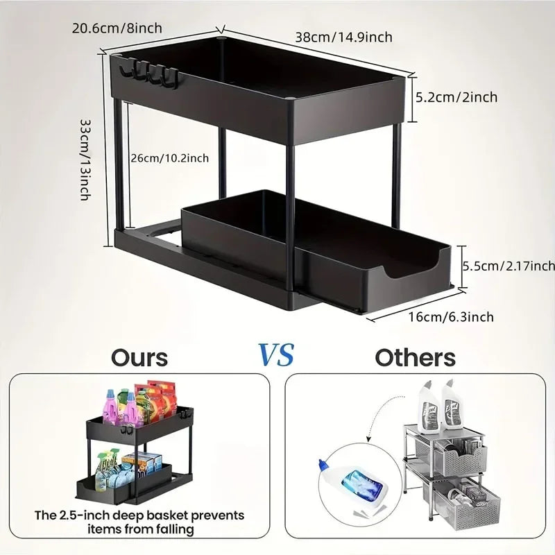 New 2 Tier Under Sink Organizer Sliding Cabinet Basket  Kitchen Organizer Organizer Storage Rack with Hooks Hanging Cup Bathroom